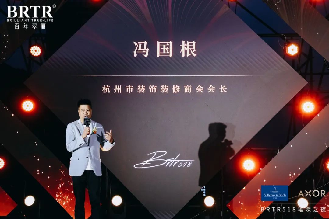 杭州市装饰装修商会会长冯国根先生致辞,自 1995 年协会成立以来,始终致力于推动建筑装饰行业与城市人居需求的深度融合。在BRTR518 设创展厅国际高端品牌具象表达为了切实可感的生活解决方案 。
