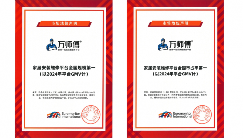据悉,今年3月,欧睿国际发布行业市场地位声明称“万师傅系家居安装维修平台全国规模及市占率双第一(以2024平台GMV计)”,稳坐行业龙头宝座。