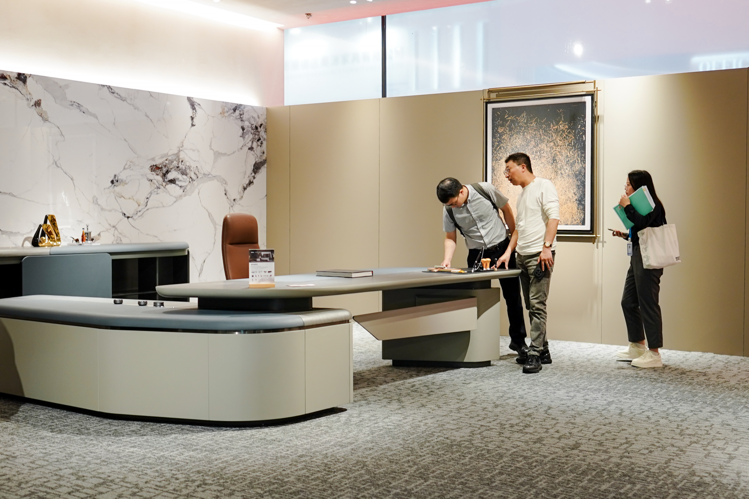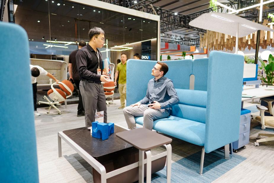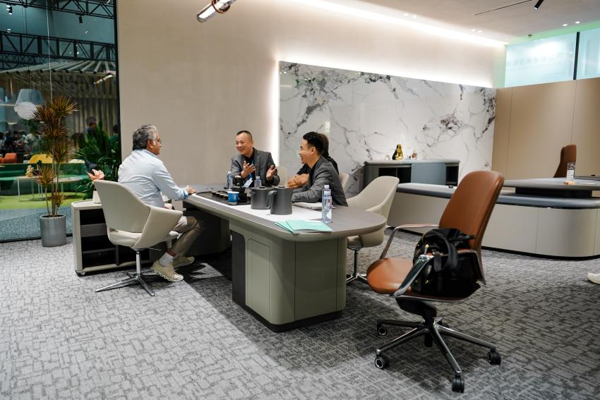 其中,名为“莱凡特”的总裁桌成为全场焦点——流畅的几何线条、精湛的皮质与细致工艺,将意式简约与东方沉稳巧妙融合,引得参观者驻足细品落座体验,现场洽谈氛围热烈。