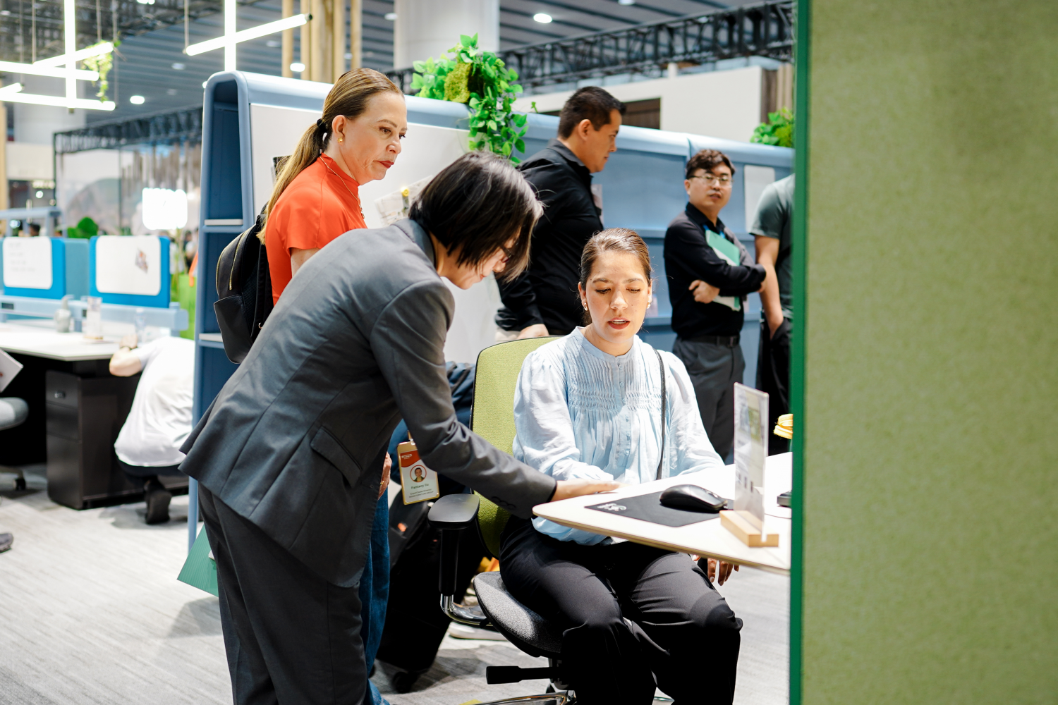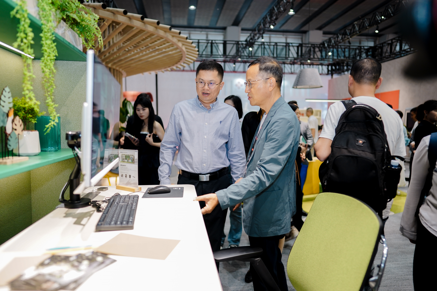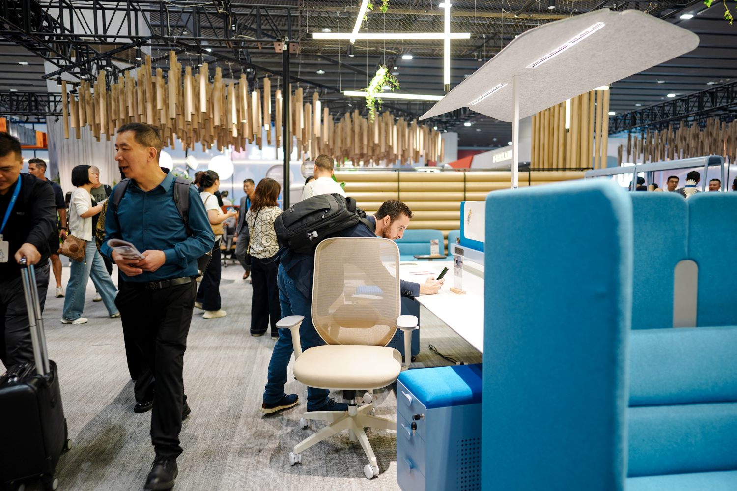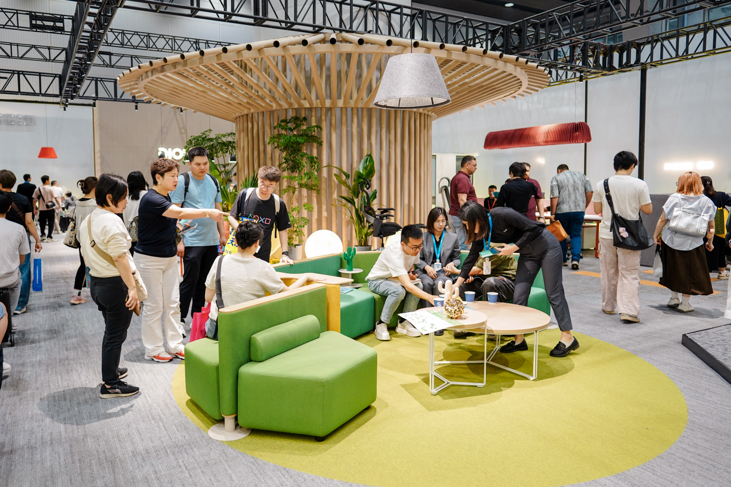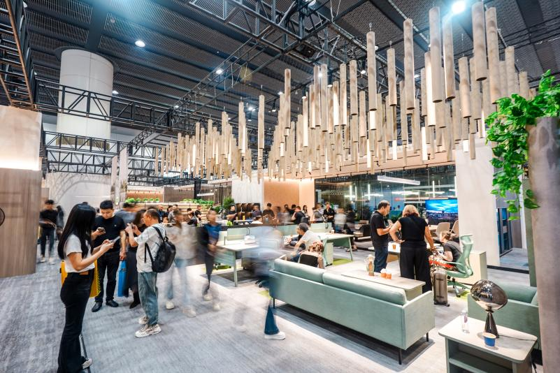展位设计以“破茧”为核心叙事,入口处半透明的渐变墙体与破墙而出的蝶翼装置,营造出强烈的视觉张力。观众从“茧”中步入,穿过绿植与木质格栅交织的“破茧之径”,最终抵达开阔的“新生之境”。这一沉浸式的空间体验,不仅让驻足者频频举起手机,更引发了现场关于“未来办公形态”的热烈讨论。